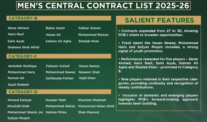 Compared to last year’s list of 27 contracted players, the PCB has expanded the pool to 30. It includes 12 fresh additions, highlighting the emergence of promising new talent. “The Board’s strategic focus on squad depth and future development.”